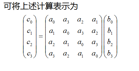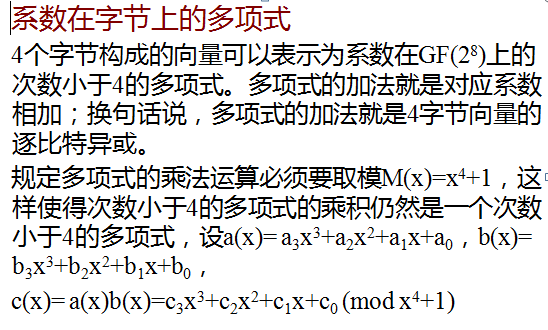 给定两个系数多项式:a(x)= a3x^3+a2x^2+a1x+a0,b(x)= b3x^3+b2x^2+b1x+b0,我们定义系数多项式的模乘运算为c(x)= a(x)b(x)=c3x^3+c2x^2+c1^x+c0 (mod x^4+1),这里模x^4+1是为了使得次数小于4 的多项式的乘积仍然是一个次数小于4 的多项式,这时,所以我们将上面的运算表示为