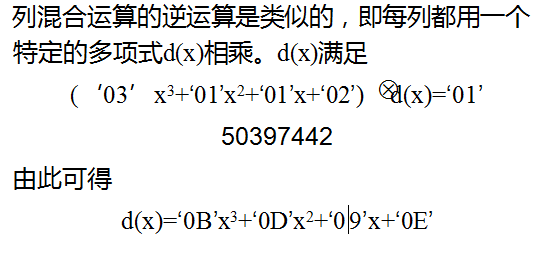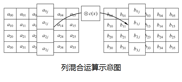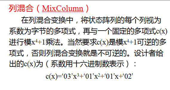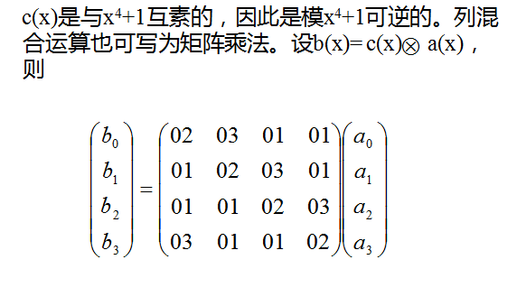 在列混合变换中, 将状态阵列的每个列视为GF(2^8 ) 上的多项式, 再与一个固定的多项式c( x )进行模x^4 + 1 乘法。当然要求c( x) 是模x^4 + 1 可逆的多项式, 否则列混合变换就是不可逆的, 因而会使不同的输入分组对应的输出分组可能相同。