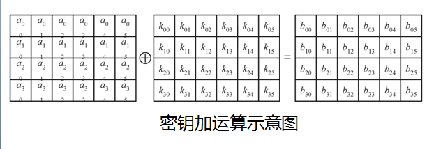 密钥加是将轮密钥简单地与状态进行逐比特异或。轮密钥由种子密钥通过密钥编排算法得到, 轮密钥长度等于分组长度Nb。状态State 与轮密钥RoundKey 的密钥加运算表示为AddRoundKey ( State, RoundKey),密钥加的整体效果图: