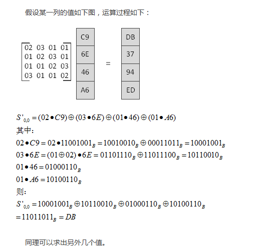 这里有必要说明下,如何将每个列视为GF(2^8 )上的多项式。还记得我们上面说的对于单个字节,可以将单个字节视为多项式,这里,我们知道,每个列是4字节,这里引入系数在GF(2^8 )上的多项式的概念:
