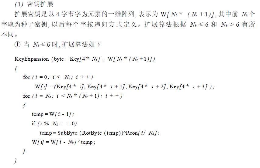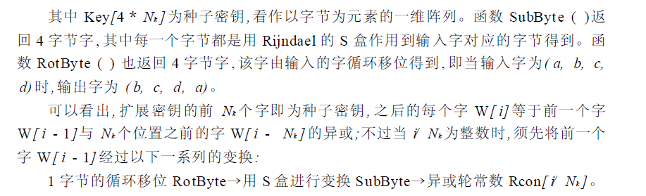 其中CipherKey 是种子密钥, ExpandedKey 是扩展密钥。密钥扩展可以事先进行( 预计算) , 且Rijndael 密码的加密算法可以用这一扩展密钥来描述, 即1