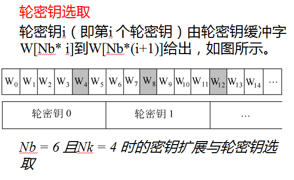 - 轮密钥从扩展密钥中取, 其中第1 轮轮密钥取扩展密钥的前Nb 个字, 第2 轮轮密钥取接下来的Nb 个字, 如此下去。