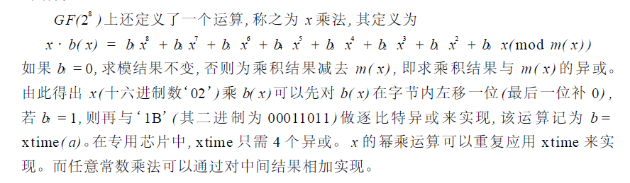 由于a0和b0的取值范围都是[0,255],但他们两的乘法运算并不采用字节多项式采用的模乘运算法则,他们采用另一种运算法则,我们称之为x乘法,给出x乘法的运算法则: