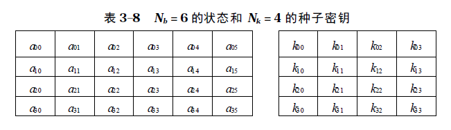 种子密钥类似地用一个以字节为元素的矩阵阵列表示, 该阵列有4 行, 列数记为Nk , Nk等于分组长度除以32。表3-8 是Nb = 6 的状态和Nk = 4 的种子密钥的矩阵阵列表示。