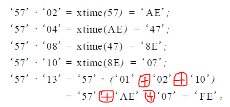 这样算:由于0x10是0x2^4,即0x10 x 0x57(这里的乘法是x乘法)=(0x2 x (0x2 x (0x2 x (0x2 x 0x57)))),也就是说相当于向左移4位,根据x乘法的运算规则,在每一次和0x2相乘时都采用x乘法运算法则,描述为0x57 x 0x2进行x乘法,结果再与2进行x乘法,结果再与2进行x乘法,结果再与2进行x乘法,然后就得到了最终结果了,恩,就是这样。对于0x57和0x13的x乘法,给出下图: