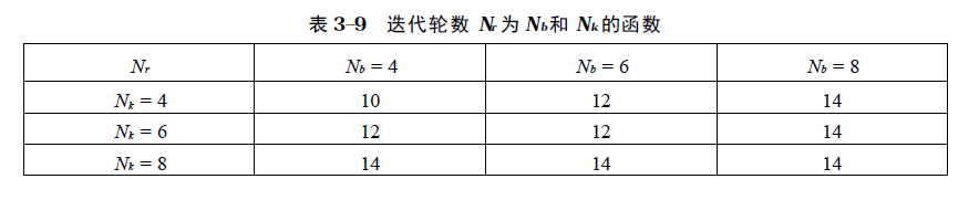 算法的输入和输出被看成是由8 比特字节构成的一维数组, 其元素下标的范围是0~(4 Nb - 1 ) , 因此输入和输出以字节为单位的分组长度分别是16、24 和32 , 其元素下标的范围分别是0~15、0~23 和0~31。输入的种子密钥也看成是由8 比特字节构成的一维数组, 其元素下标的范围是0~( 4 Nk - 1) , 因此种子密钥以字节为单位的分组长度也分别是16、24 和32 , 其元素下标的范围分别是0~15、0~23 和0~31。算法的输入( 包括最初的明文输入和中间过程的轮输入) 以字节为单位按a00 a10 a20 a30 a01 a11 a21 a31 ⋯ 的顺序放置到状态阵列中。同理, 种子密钥以字节为单位按k00 k1 0 k20 k30 k01 k1 1 k21 k31 ⋯ 的顺序放置到种子密钥阵列中。而输出( 包括中间过程的轮输出和最后的密文输出) 也是以字节为单位按相同的顺序从状态阵列中取出。若输入(或输出) 分组中第n 个元素对应于状态阵列的第( i, j ) 位置上的元素, 则n 和( i, j ) 有以下关系:i = n mod 4; j = n/ 4的结果下取整 ; n = i + 4 j迭代的轮数记为Nr , Nr与Nb 和Nk 有关, 表3 -9 给出了Nr 与Nb和Nk 的关系。