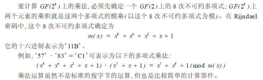 这里对于系数多项式,对于系数多项式的模乘运算,要说这本书真是写的烂,这些具体的计算细节啊原则啊什么的从来都不写出来,搞得我云里雾里的。。。从网上无意间发现了下面东西-密码算法详解——AES其中有讲解系数多项式模乘运算的细节,直接截图: